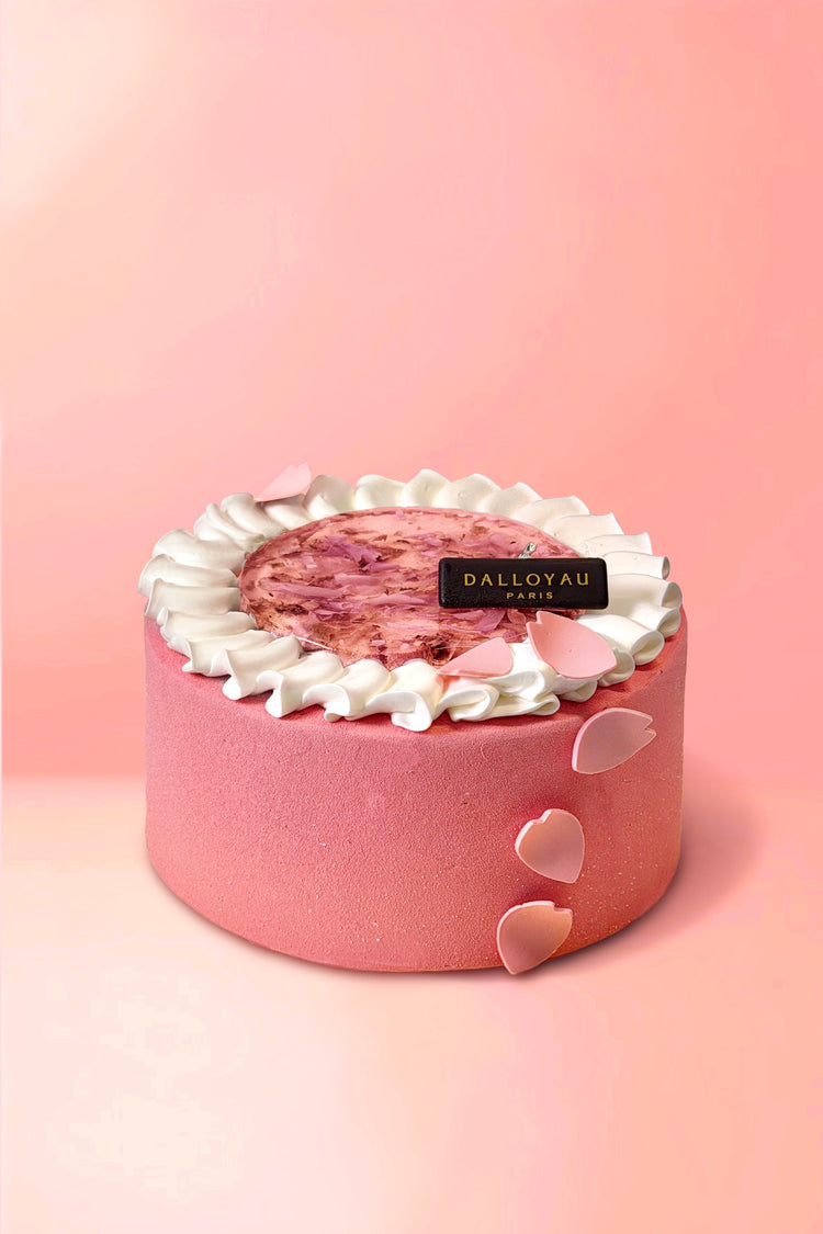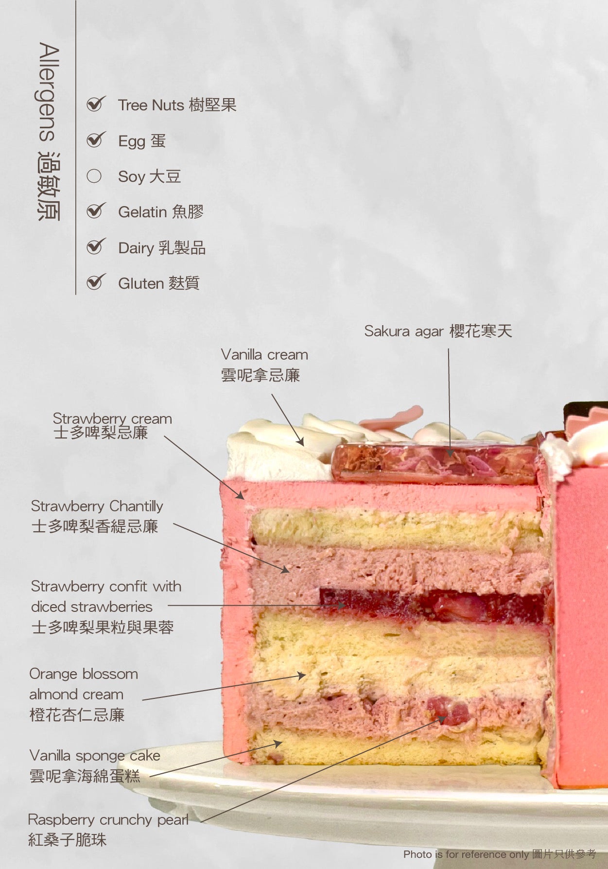 Discover the delicate harmony of fresh berry brightness and the romantic essence of sakura blossoms with this spring delight - airy almond sponge layered with fragrant orange blossom cream and vibrant strawberry confit studded with juicy diced strawberries. A clever touch of crispy raspberry pearls adds a delightful surprise to the silky, melt-in-the-mouth texture. The cake is enveloped in a dreamy pink hue, with elegant white cream borders framing a romantic sakura agar centerpiece on top, exuding rich springtime fragrance and timeless French sophistication.