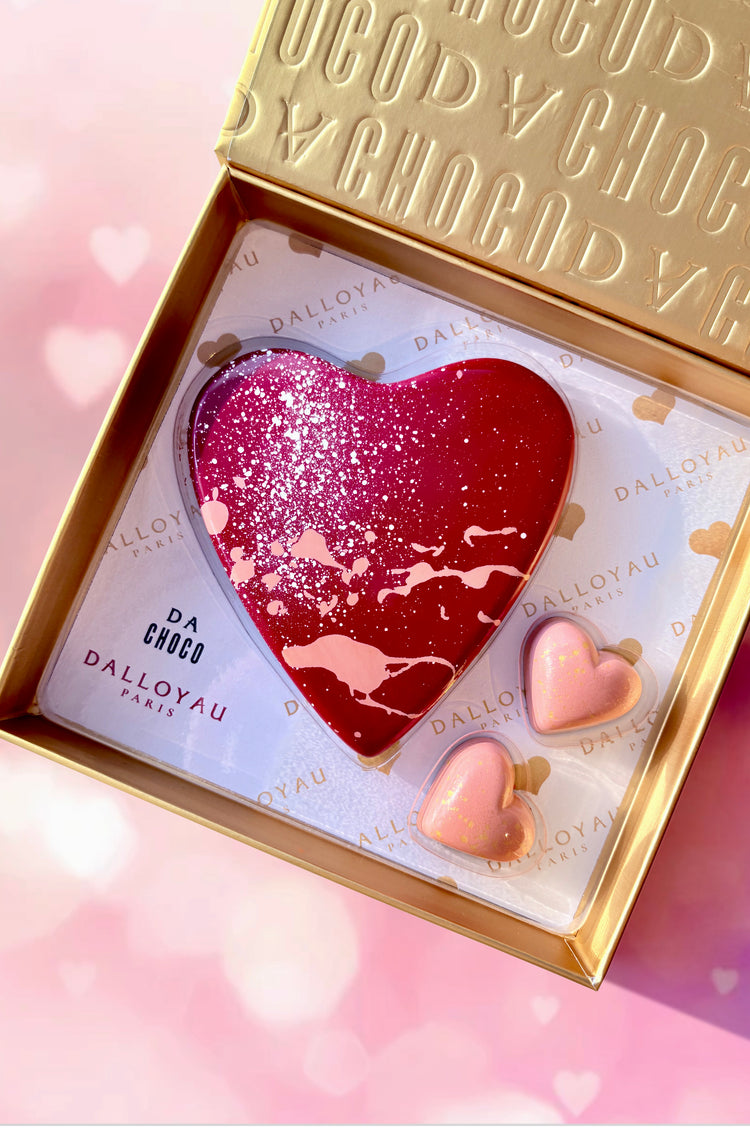 朱古力是情人節不可或缺的浪漫語言;這款高貴浮雕金色禮盒,盛載著由 DALLOYAU 與米芝蓮二星餐廳Arbor主廚 Eric Räty 聯手研創的心型DA CHOCO 開心果脆朱古力,並伴以兩顆紫羅蘭黑莓精品手工朱古力。每顆皆嚴選頂級原料新鮮製作,絕無添加防腐劑,共同鑄就一份非凡貼心、蘊含濃情蜜意的情人節禮物。